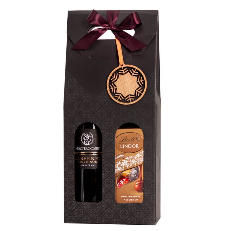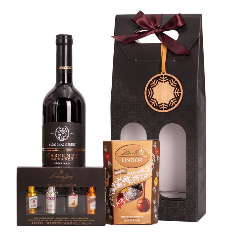 Vörösbor és csokoládé válogatás elegáns díszbe bújtatva. A bor és a csokoládék mellé egy karácsonyfadísz is került az összeállításba. Remek választás karácsony alkalmából.