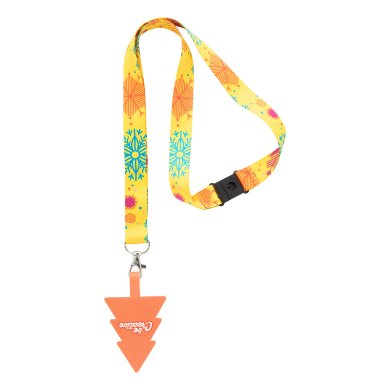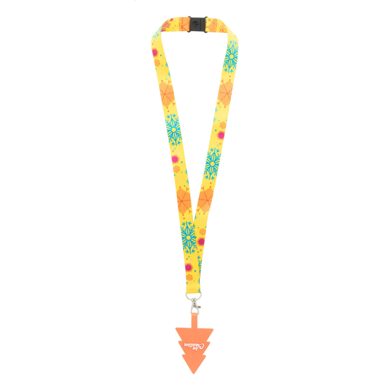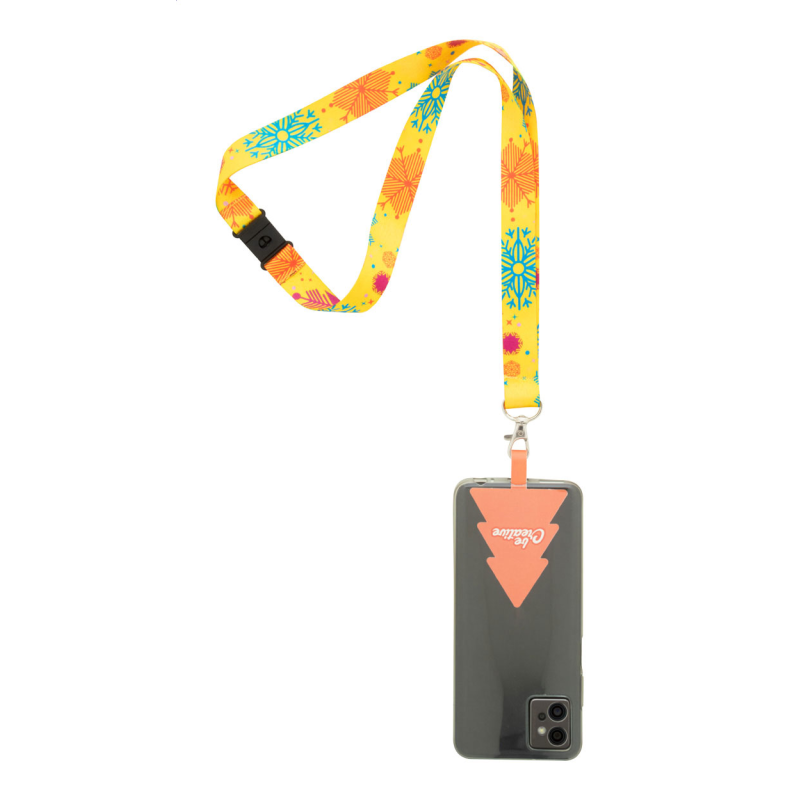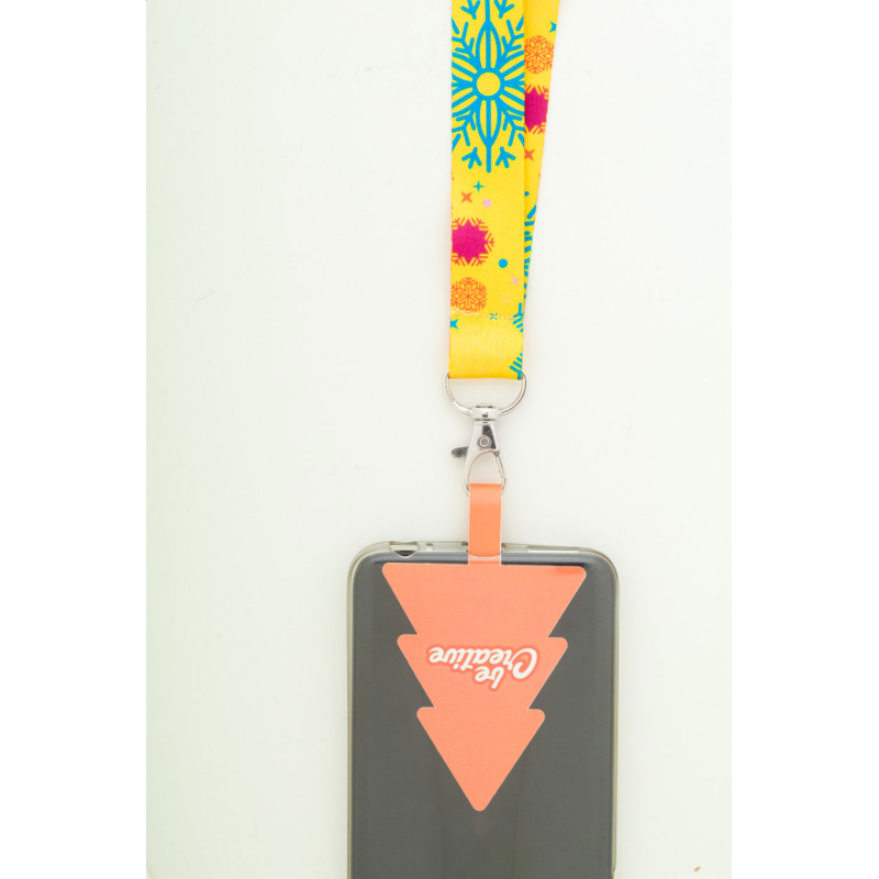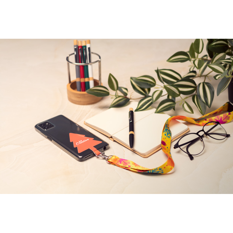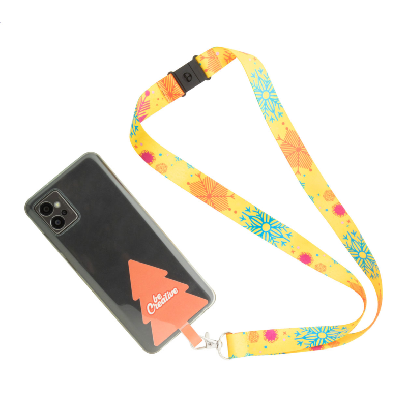Egyedi gyártású RPET mobiltartós nyakpánt fém karabinerrel, biztonsági csattal és full colour nyomtatott, karácsonyfa alakú telefontartóval szakadásálló papírból.
