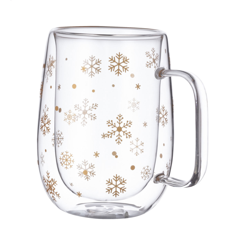 Duplafalú thermo bögre boroszilikát üvegből hópehely mintával, 400 ml. Fekete papírdobozban szállítjuk.