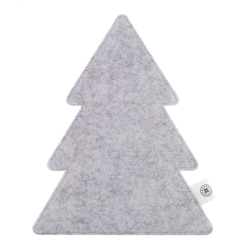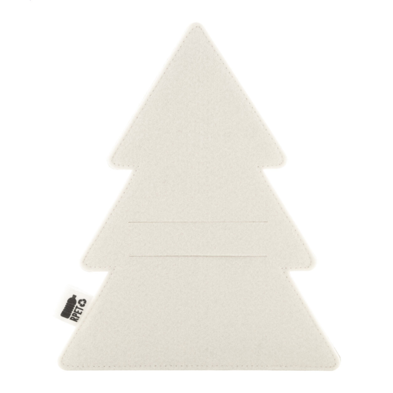Egyedi gyártású, karácsonyfa alakú RPET filc evőeszköztartó full colour nyomtatott előlappal és megkülönböztető RPET címkével.