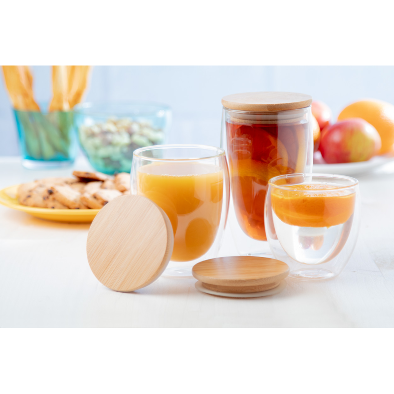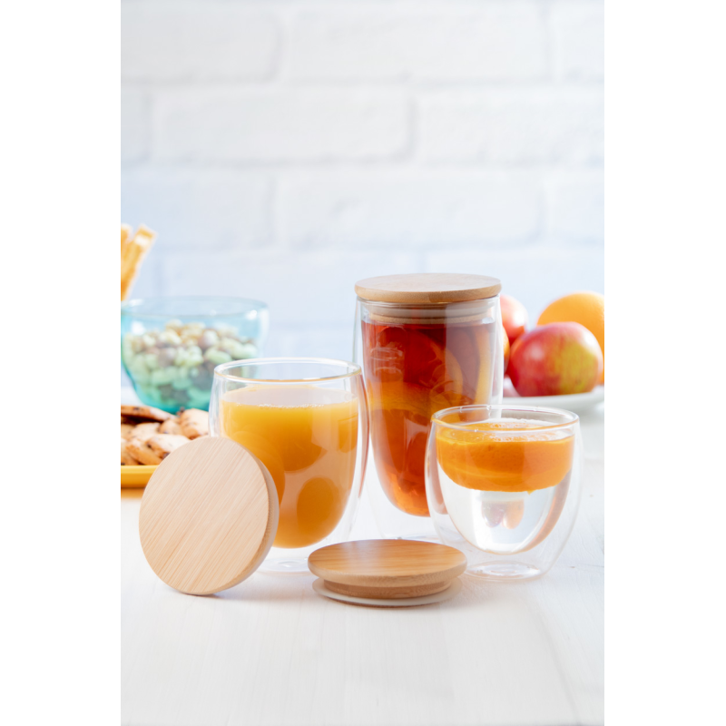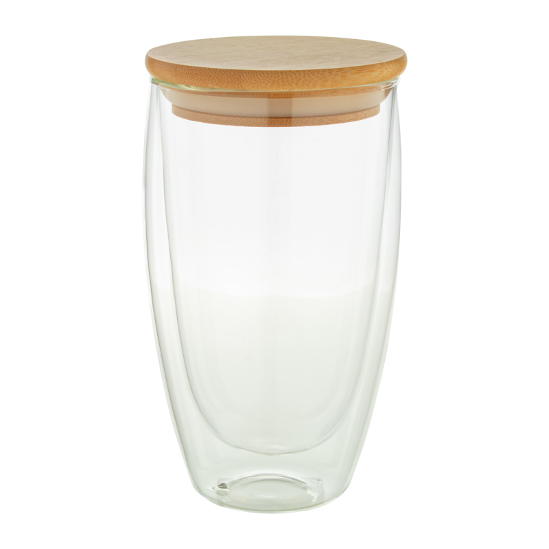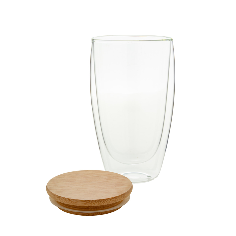 Duplafalú thermo pohár boroszilikát üvegből, bambusz fedéllel, 420 ml. Kraft papír dobozban szállítjuk.