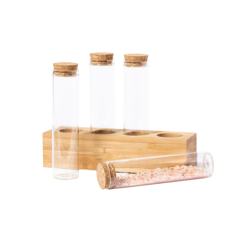 4 db-os fűszertartó szett boroszilikát üvegből, természetes parafa tetővel és bambusz állvánnyal, 70 ml.
