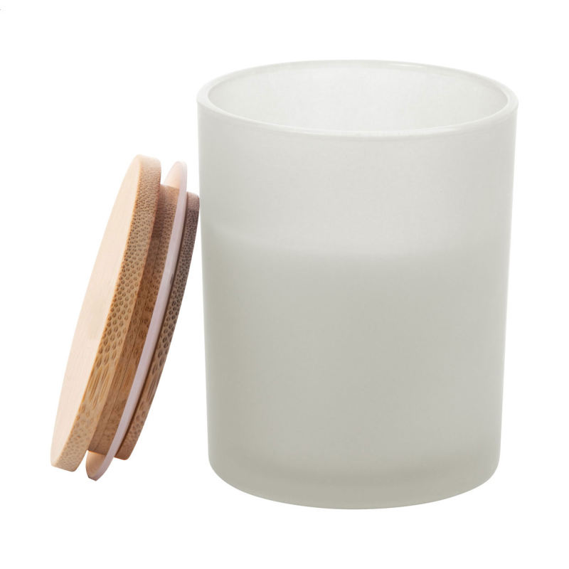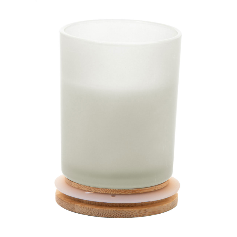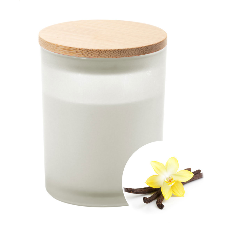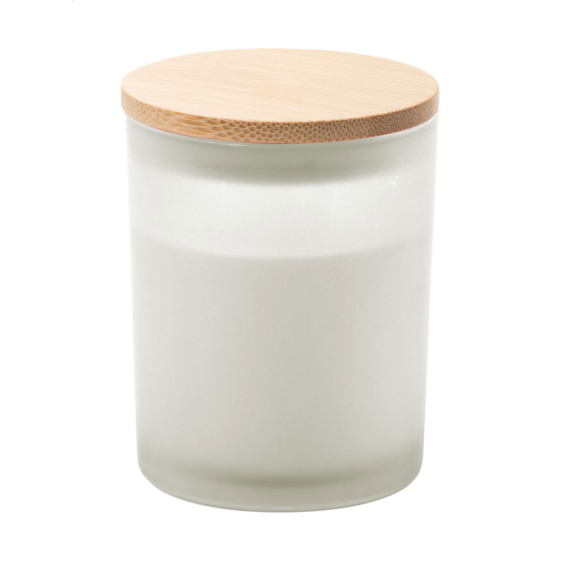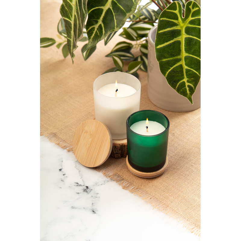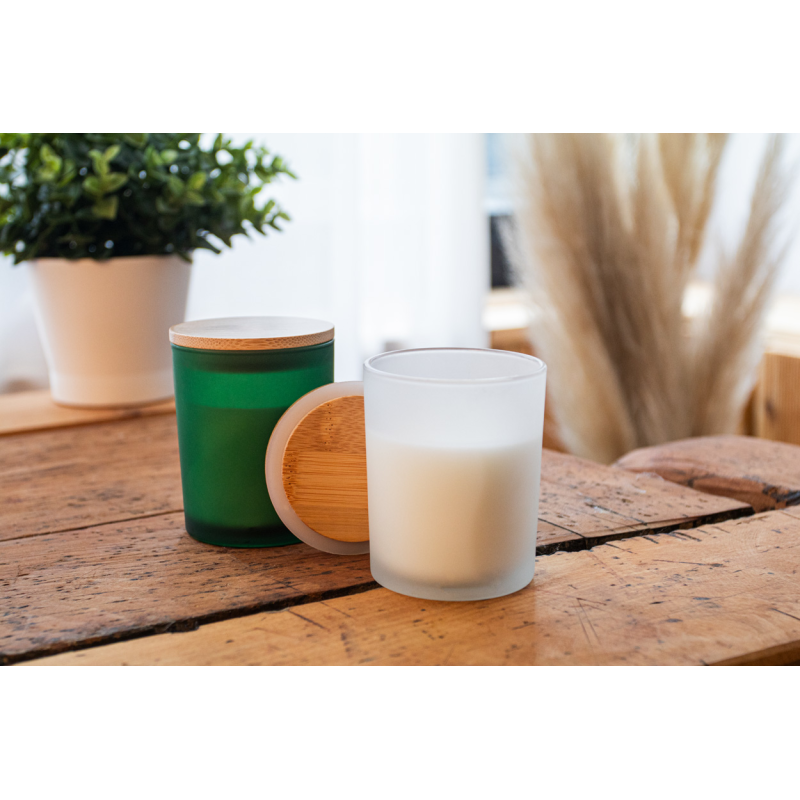 Növényi alapú illatgyertya homokfúvott üvegtartóban, bambusz tetővel. 200 gramm viaszt tartalmaz.