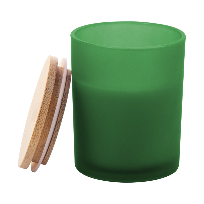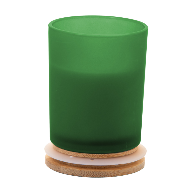 Növényi alapú illatgyertya homokfúvott üvegtartóban, bambusz tetővel. 200 gramm viaszt tartalmaz.