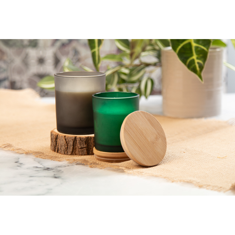 Növényi alapú illatgyertya homokfúvott üvegtartóban, bambusz tetővel. 200 gramm viaszt tartalmaz.