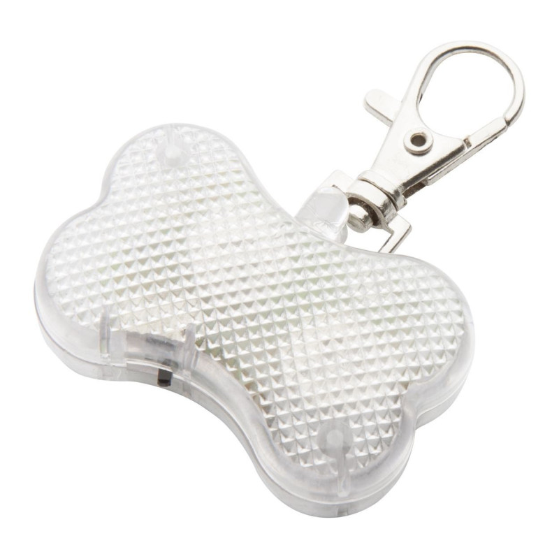 Csont alakú nyakörvre akasztható villogó fém karabinerrel. Gombelemmel szállítjuk.