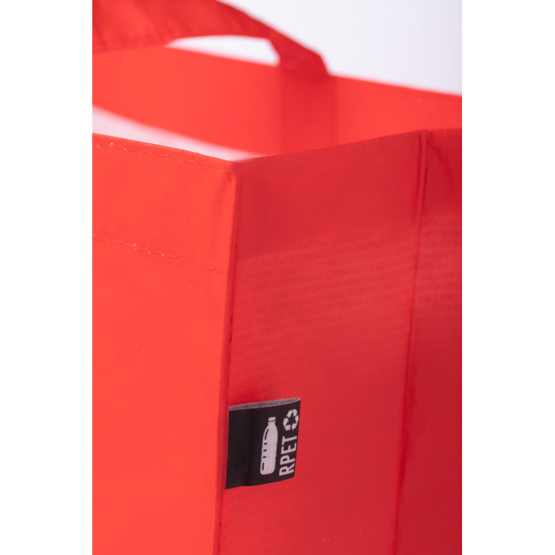 Laminált RPET bevásárlótáska közepes hordfüllel és betoldással, RPET poliészter 105 g/m². Megkülönböztető RPET címkével.