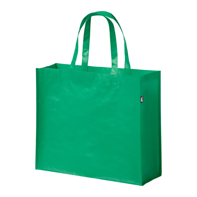 Laminált RPET bevásárlótáska közepes hordfüllel és betoldással, RPET poliészter 105 g/m². Megkülönböztető RPET címkével.