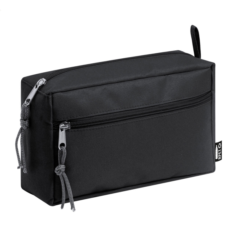 RPET kozmetikai táska 2 cipzáras rekesszel, 600D RPET poliészter. Megkülönböztető RPET címkével.