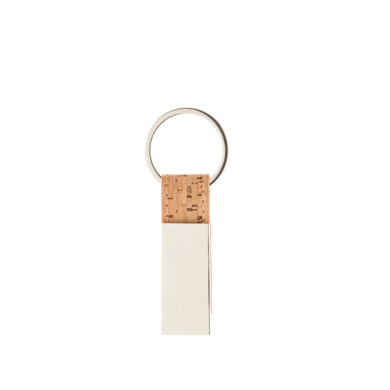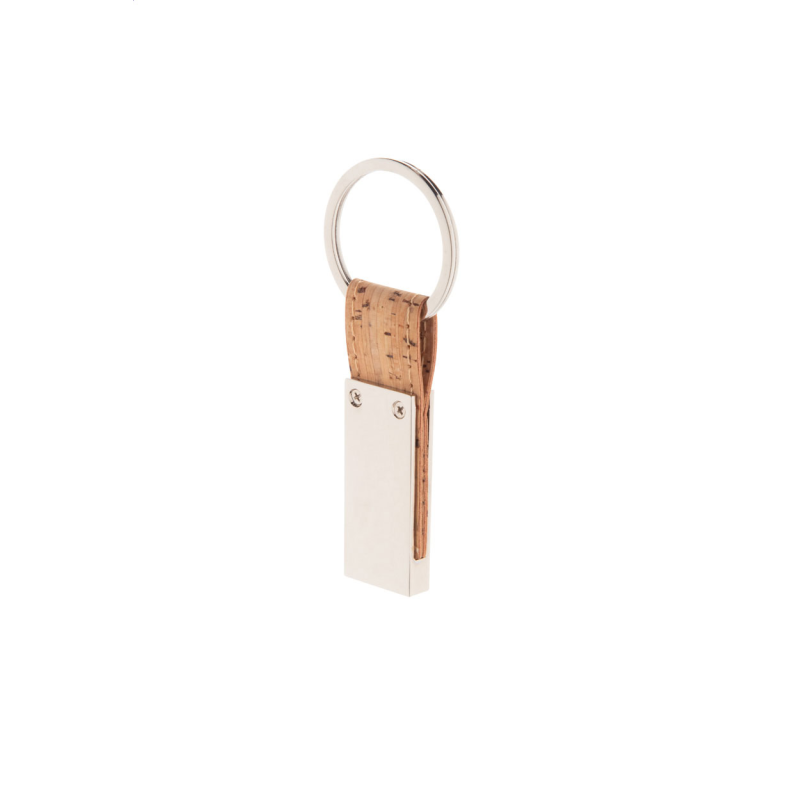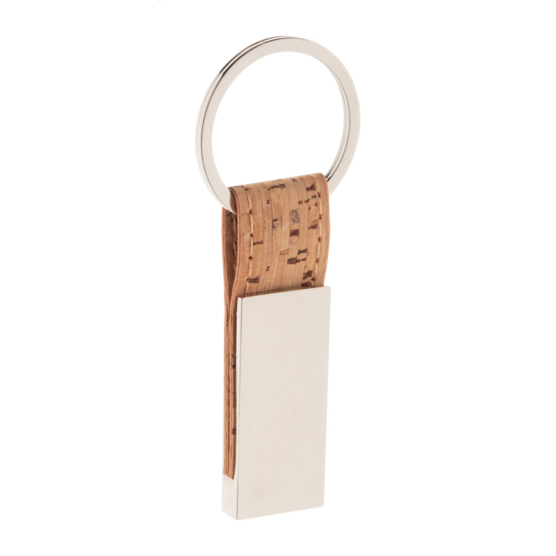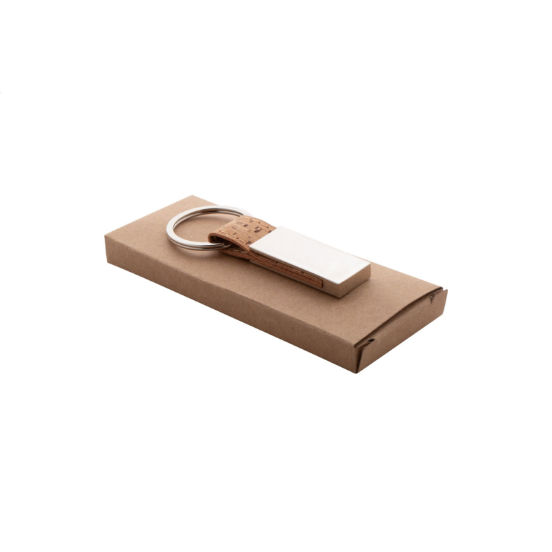 Téglalap alakú fém kulcstartó természetes parafa és PU bőr szíjjal. Kraft papír dobozban szállítjuk.