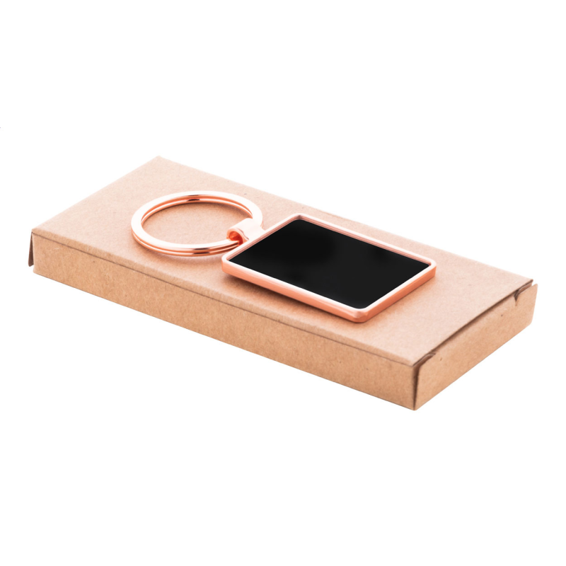 Téglalap alakú fém kulcstartó arany kivitelben, fegyverfém lemezzel. Kraft papír dobozban.