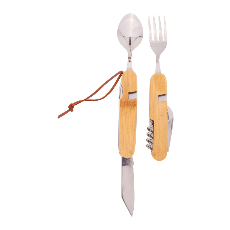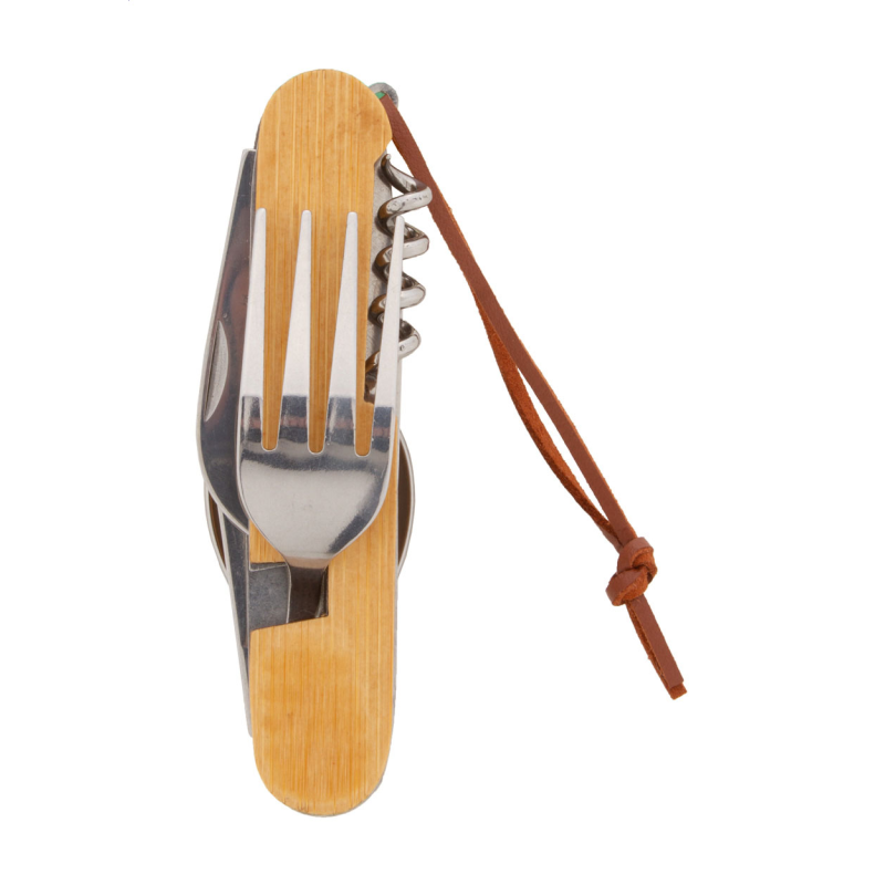 Rozsdamentes acélból készült többfunkciós zsebkés és összecsukható evőeszközkészlet bambusz nyéllel és PU bőr zsinórral.