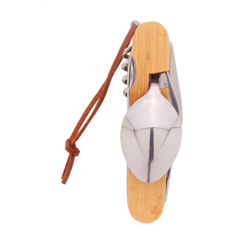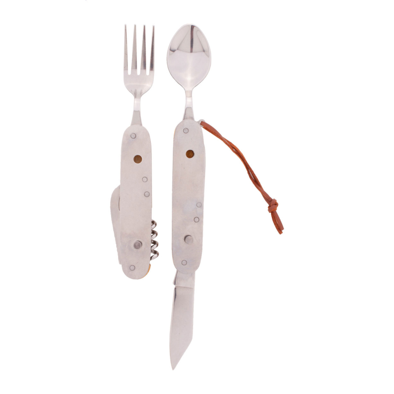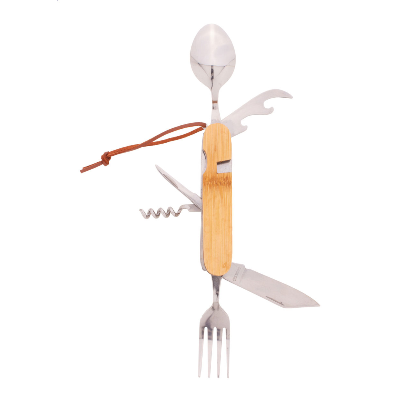 7 funkcióval: kés, villa, kanál, üveg- és konzervnyitó, dugóhúzó és bőrlyukasztó.