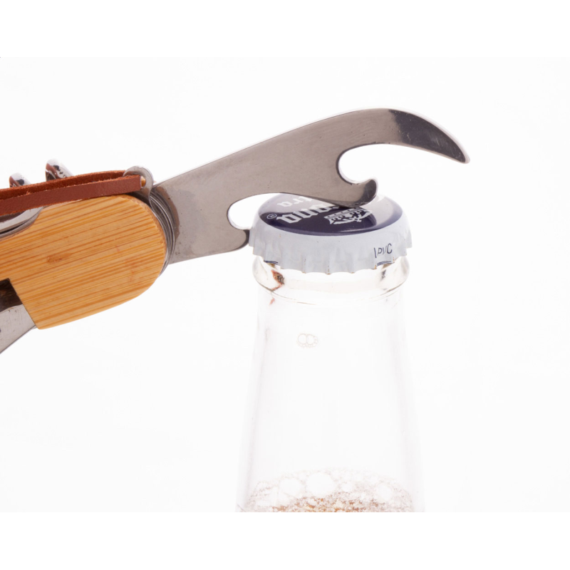 Rozsdamentes acél zsebkés, bambusz nyéllel és 9 funkcióval. PU bőr pánttal.