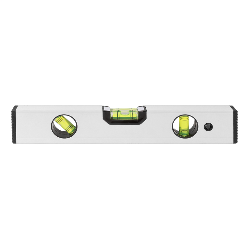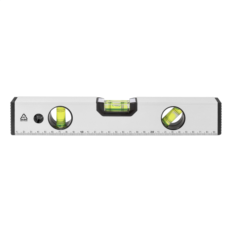Mágneses vízmérték újrahasznosított alumíniumból, három vízmértékkel (vízszintes, függőleges és 45°-os) és 30 cm-es vonalzóval.