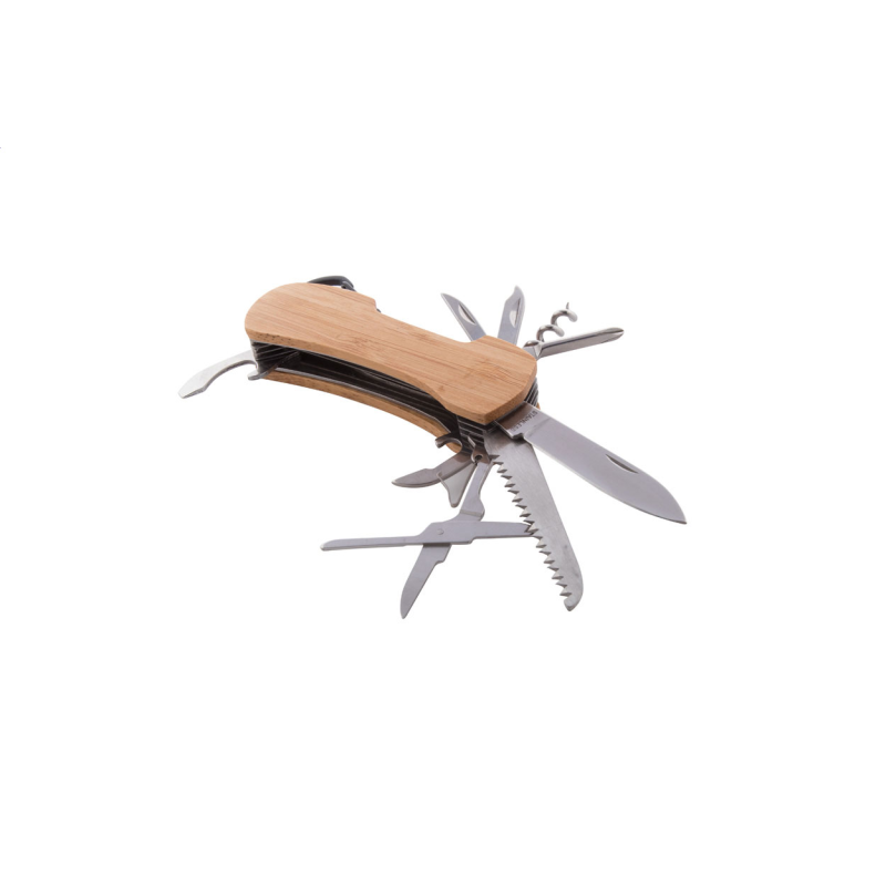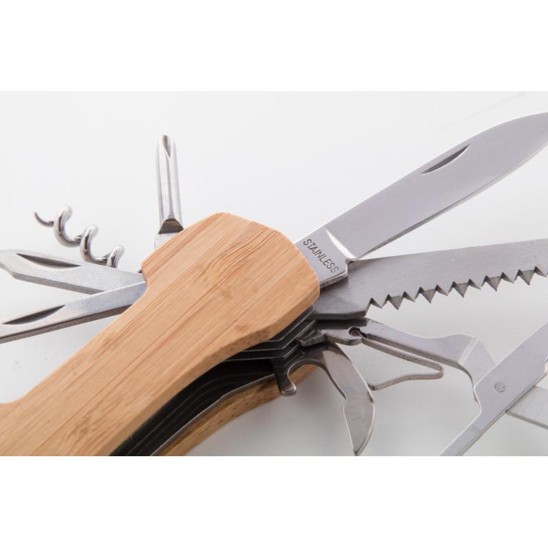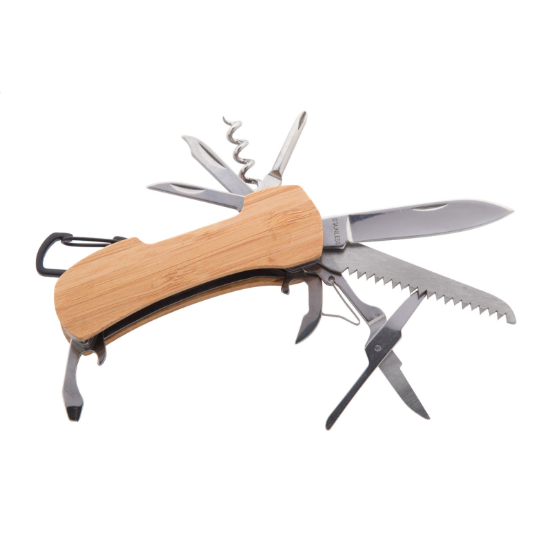 Rozsdamentes acél zsebkés karabinerrel, bambusz nyéllel és 9 funkcióval.