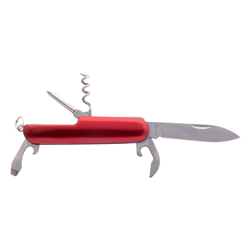 Rozsdamentes acél zsebkés alumínium nyéllel és 5 funkcióval.