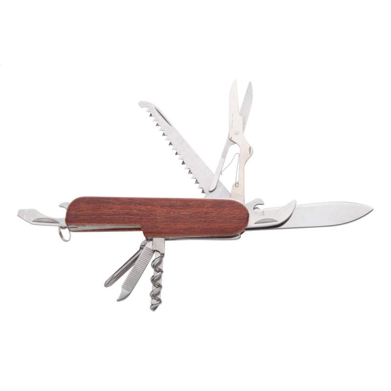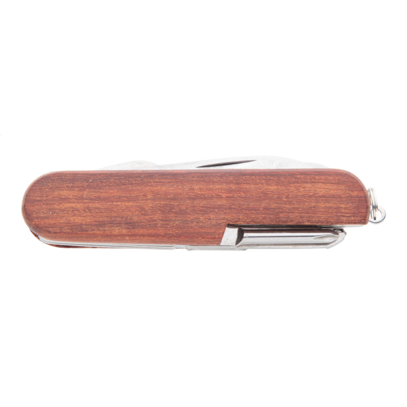 Rozsdamentes acél zsebkés fa nyéllel, 9 funkcióval.