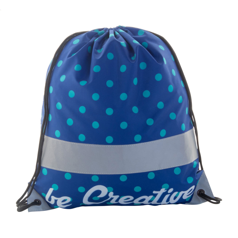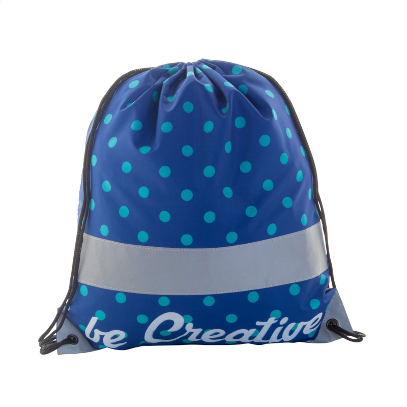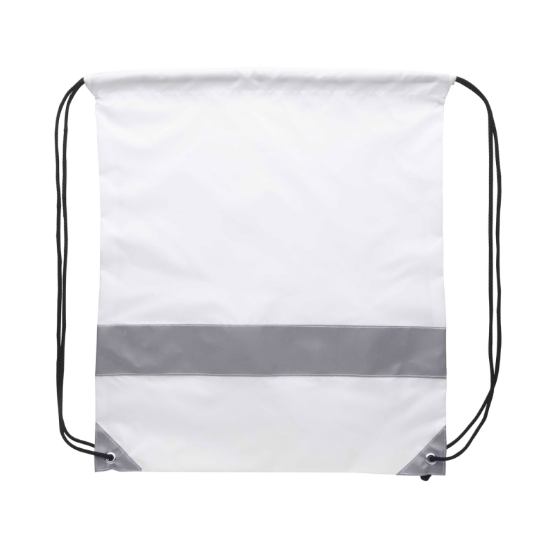 Egyedi gyártású hátizsák zsinórfüles vállpánttal, az elején fényvisszaverő csíkkal és sarkokkal, 190T poliészter.