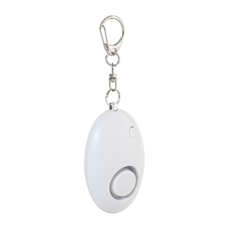 Újrahasznosított ABS személyi riasztó fém karabineres kulcstartóval és 1 LED zseblámpával.