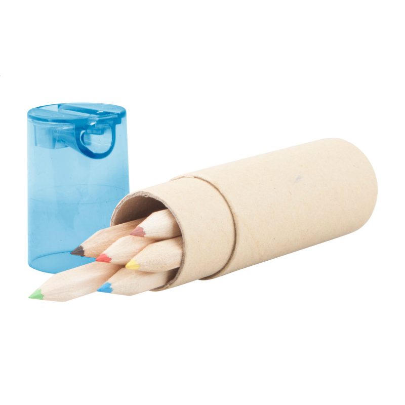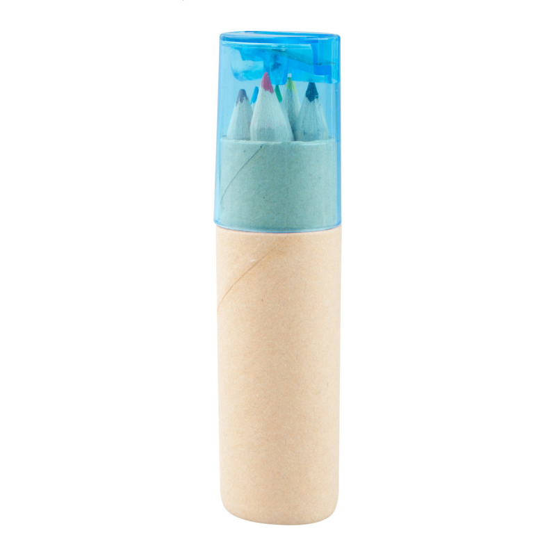 6 db rövid, színes ceruza, karton henger tokban, színes műanyag kupakkal, a kupak tetején hegyezővel.