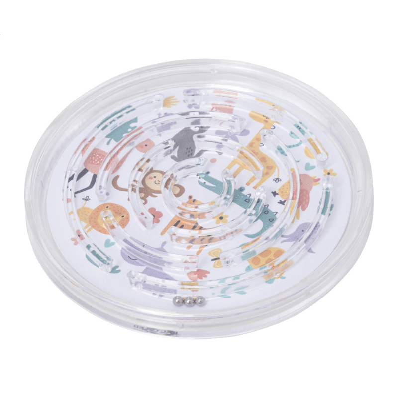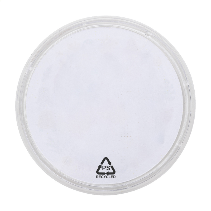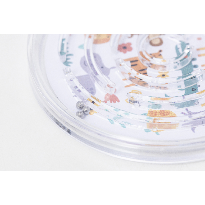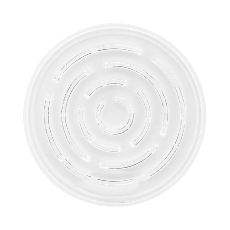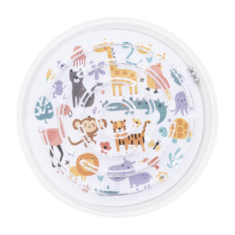Újrahasznosított PS műanyag, köralakú labirintus játék három fém golyóval. Full-colour nyomtatott papírbetéttel.