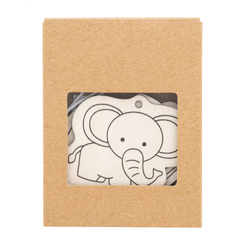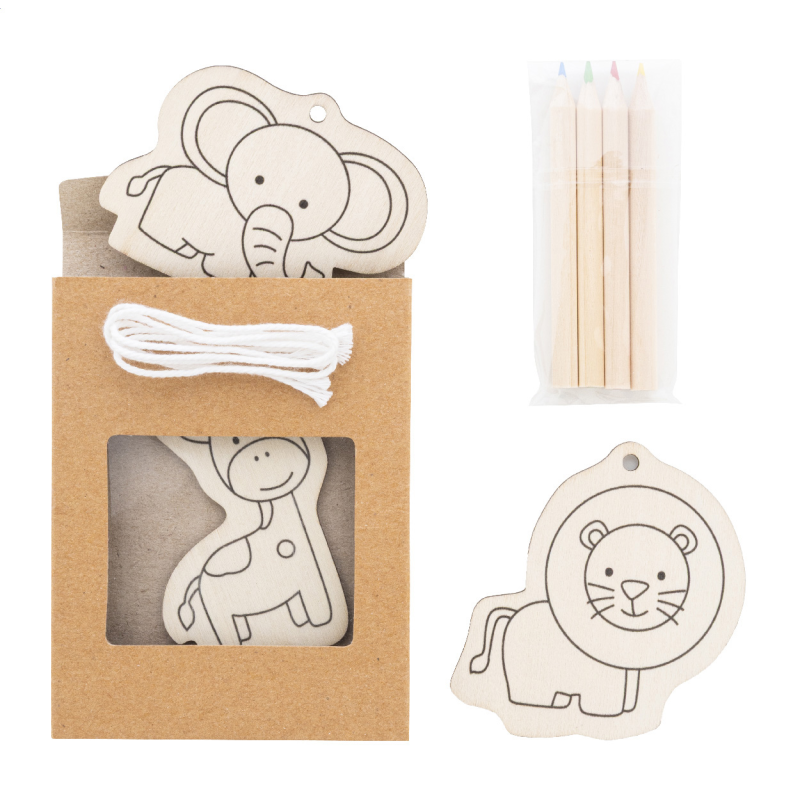 3 darabos fa állatfigurás színező szett, 4 db fa színes ceruzával és akasztózsinórral. Kraft papír dobozban.