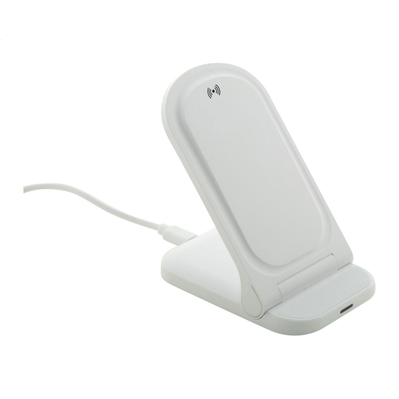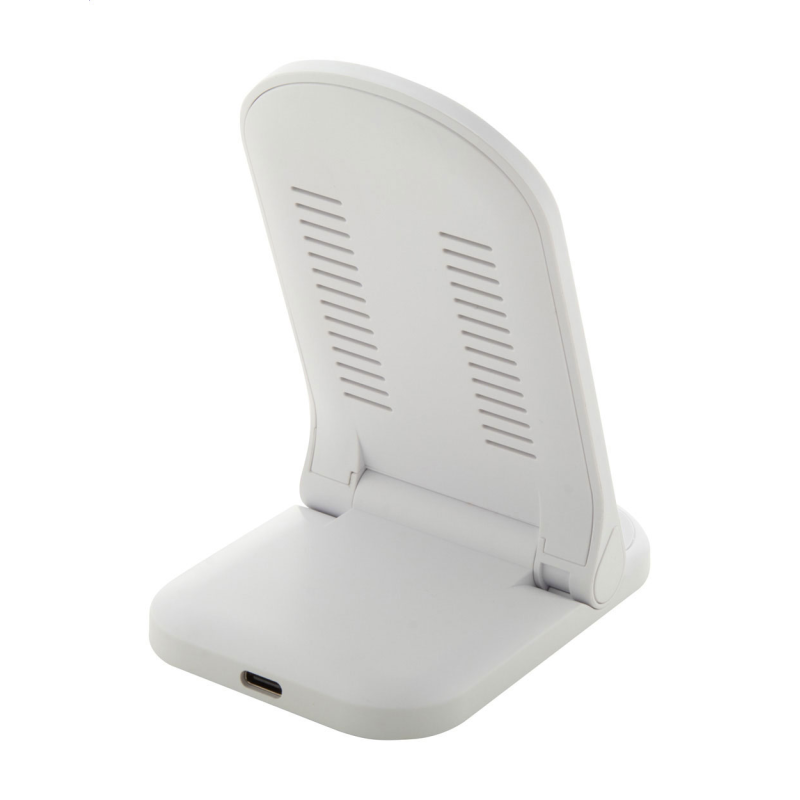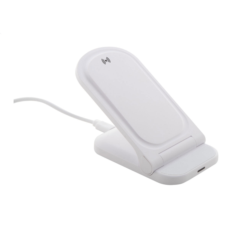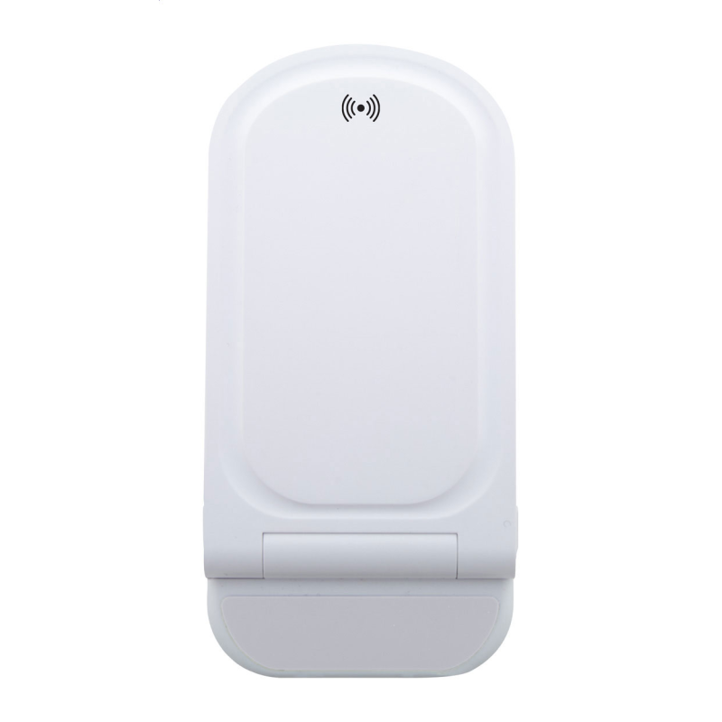 Összecsukható, állítható asztali mobiltartó újrahasznosított ABS műanyagból, beépített vezeték nélküli gyorstöltővel (15W).