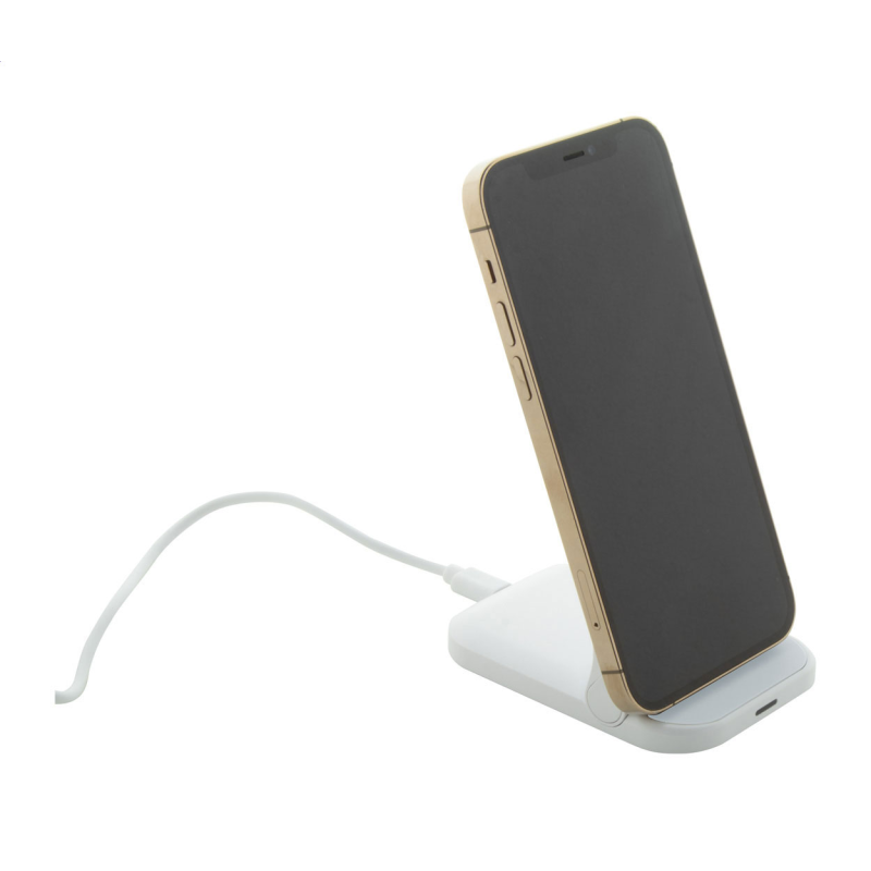Műanyag asztali mobiltelefon-tartó beépített vezeték nélküli gyorstöltővel (10W). USB töltőkábellel szállítjuk.
