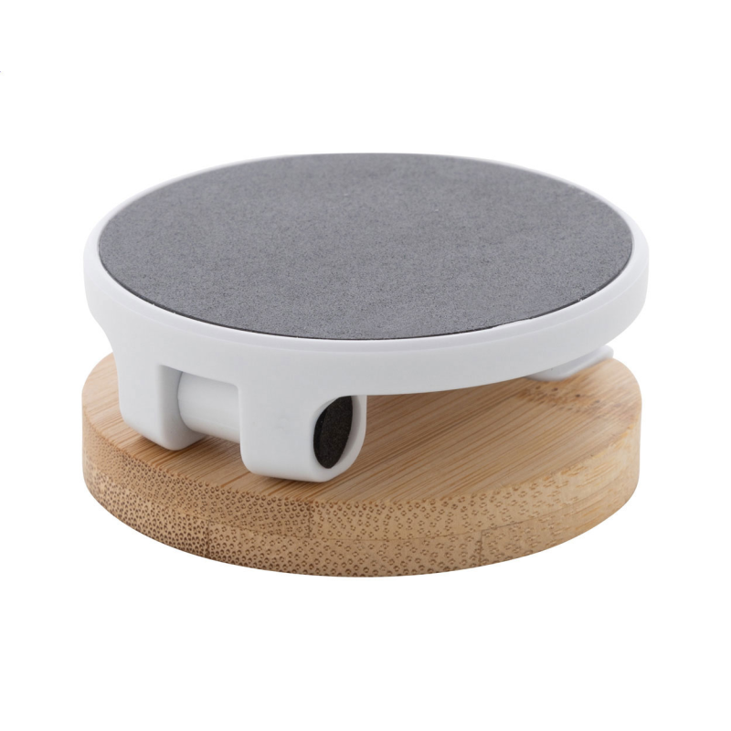 Bambusz borítású, kerek műanyag mobiltartó öntapadós rögzítéssel.