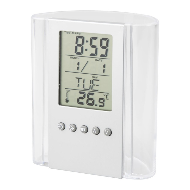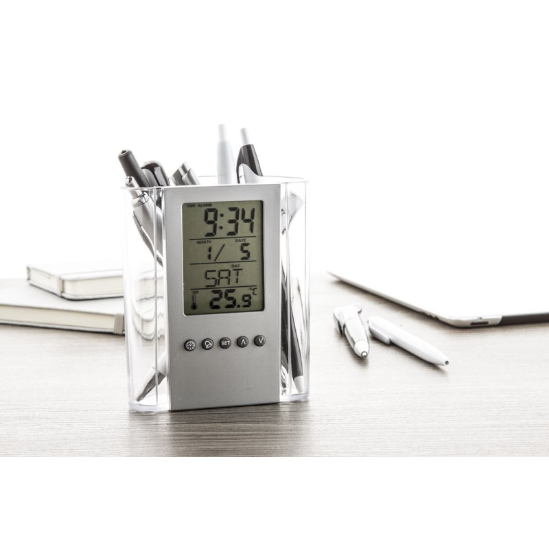 Átlátszó, műanyag tolltartó, digitális kijelzővel, (a kijelző rész levehető) mely mutatja az időt, hőmérsékletet, dátumot.