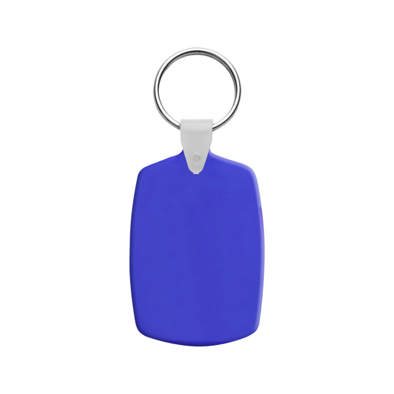 Téglalap formájú, műanyag kulcstartó fém kulcskarikával.
