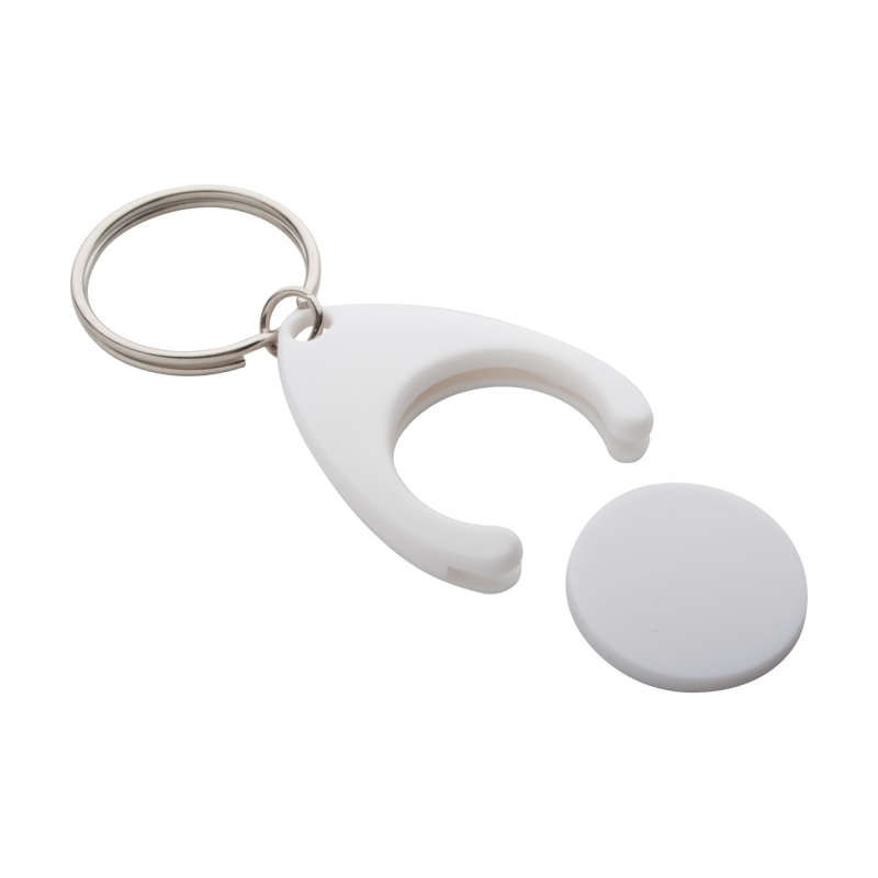 Műanyag bevásárlókocsi érme, fém kulcskarikával. Érme mérete: ø24×2 mm.