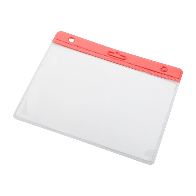 Átlátszó PVC anyagból készült kártyatartó színes sávval, nyakpántra akasztható.