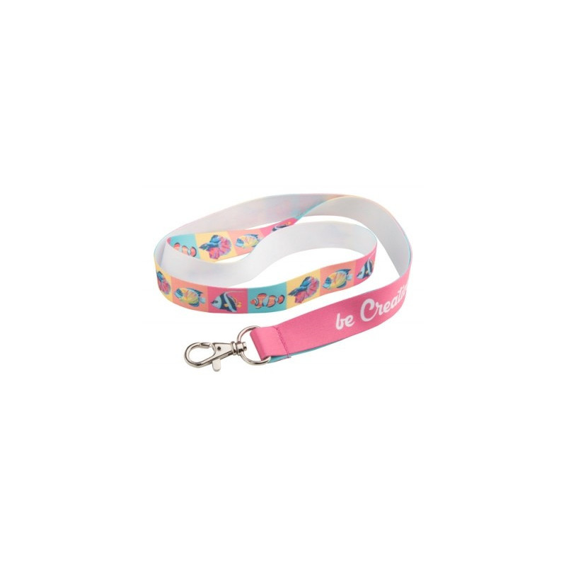 Egyedi, 15 mm széles műanyag nyakpánt levehető fém karabinerrel. Szublimációs eljárással nyomtatott grafikával mindkét oldalon.