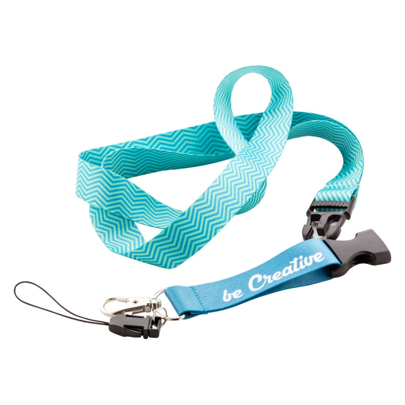 Egyedi grafikával ellátott RPET poliészter nyakpánt levehető fém karabinerrel, mobiltartóval és biztonsági csattal. Mindkét oldalán szublimációs technológiával emblémázva.