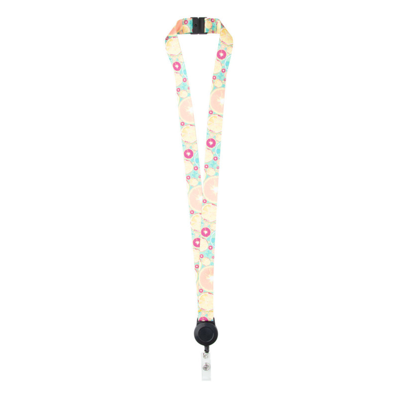 Egyedi, 15 mm széles műanyag nyakpánt fém karabinerrel és biztonsági csattal. Szublimációs eljárással nyomtatott grafikával mindkét oldalon.