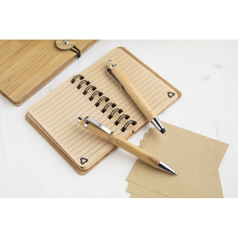 Bambusz borítású spirál jegyzetfüzet 80 db vonalas A5 méretű lapokkal. Tartalmaz egy bambusz golyóstollat fekete tollbetéttel.