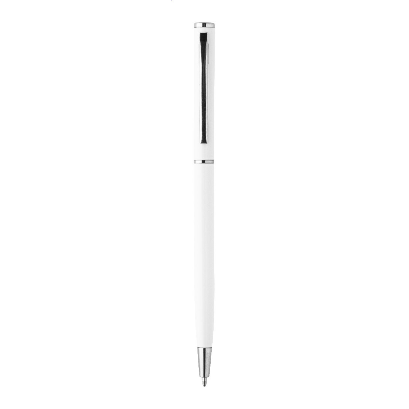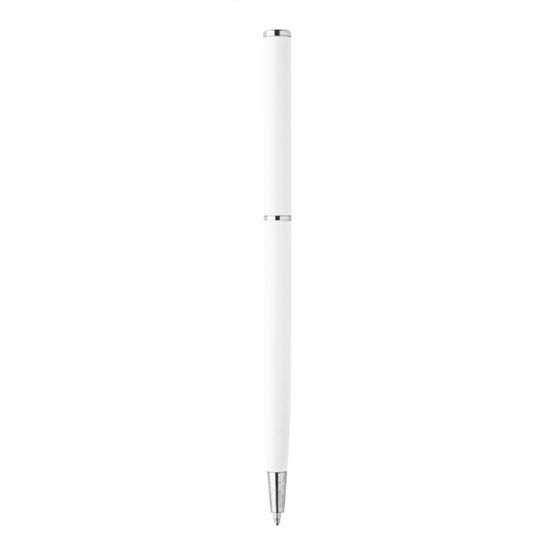 Újrahasznosított alumínium tekerős golyóstoll króm részekkel. Kék tollbetéttel.