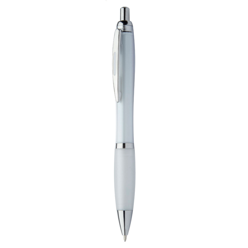 Műanyag golyóstoll fehér testtel, színes gumi markolattal, fényes króm részekkel. Kék tollbetéttel szállítjuk.