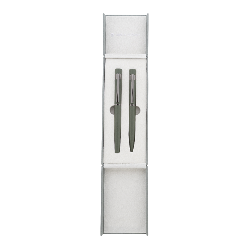Tartalmazz egy újrahasznosított alumínium golyóstollat gumírozott bevonattal és kék tollbetéttel, valamint egy újrahasznosított rozsdamentes acél kulcstartót gumírozott felülettel.
