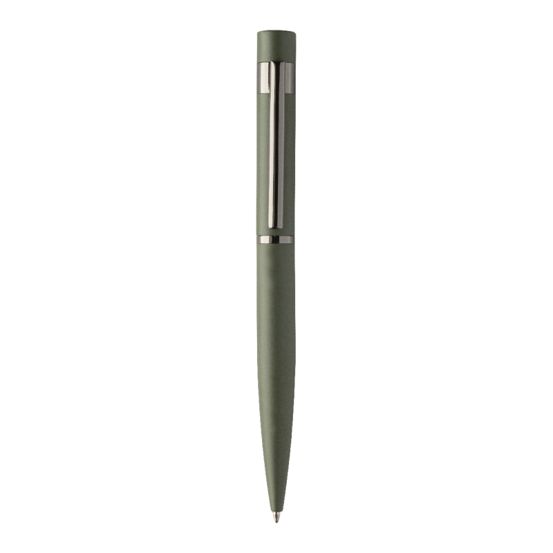 Újrahasznosított alumínium golyóstoll fémes felületű részekkel. Kék tollbetéttel szállítjuk.