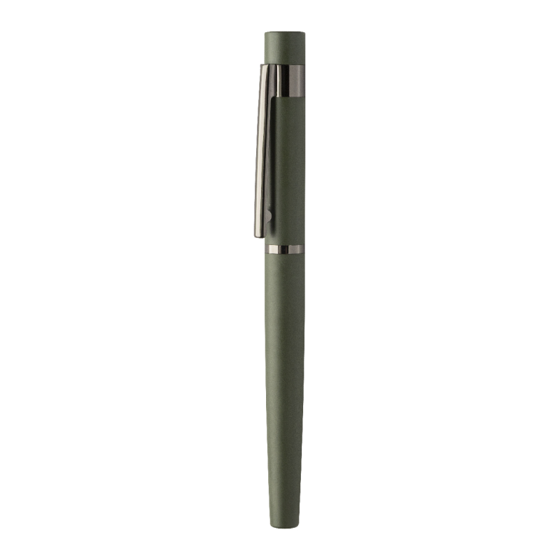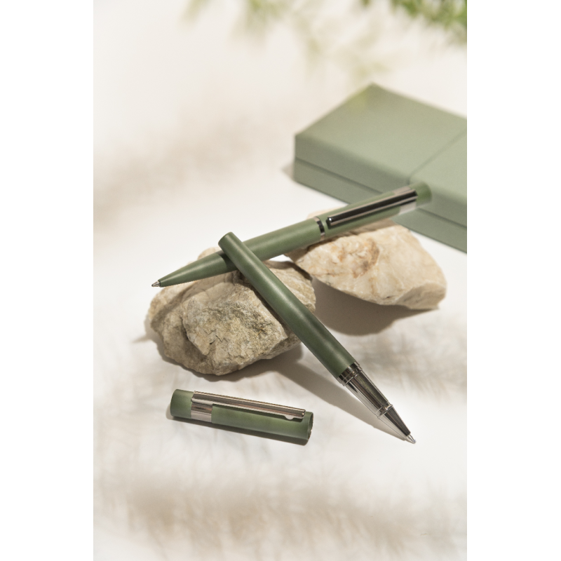 Újrahasznosított alumínium golyóstoll gumírozott felülettel és rózsaarany részletekkel.