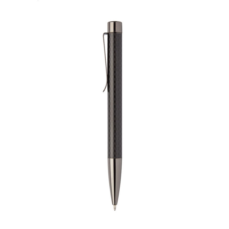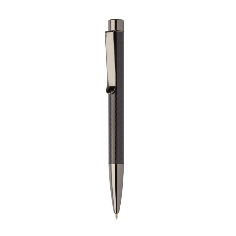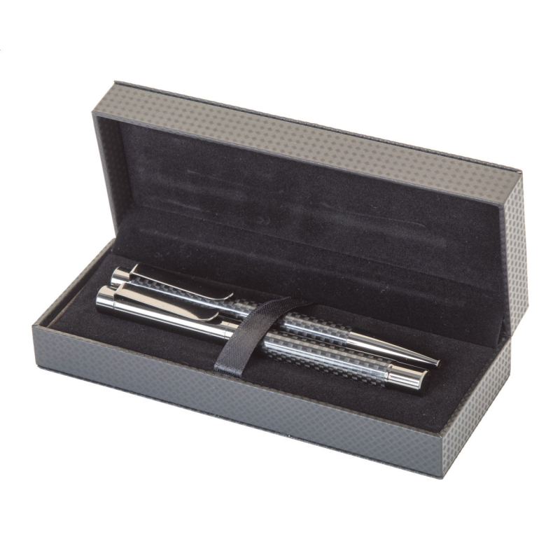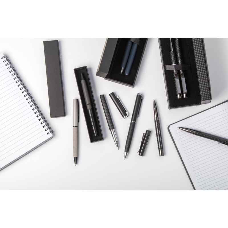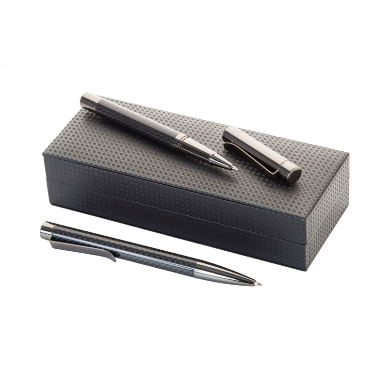 Elegáns, fém golyóstoll és rollertoll szett, szénmintás testtel és fémes felületű részekkel.