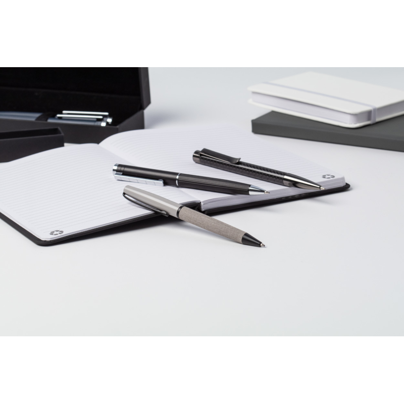 Újrahasznosított papírból készült, 60 oldalas spirálozott jegyzetfüzet, papír golyóstollal.