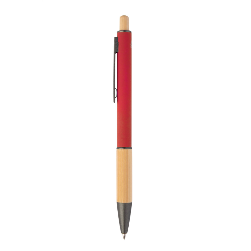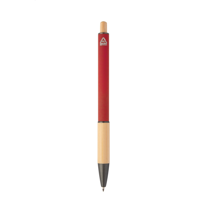 Újrahasznosított alumínium golyóstoll bambusz markolattal és gombbal, gumírozott testtel és fémes részekkel. Kék tollbetéttel szállítjuk.