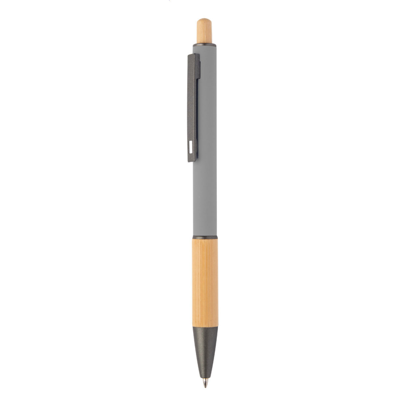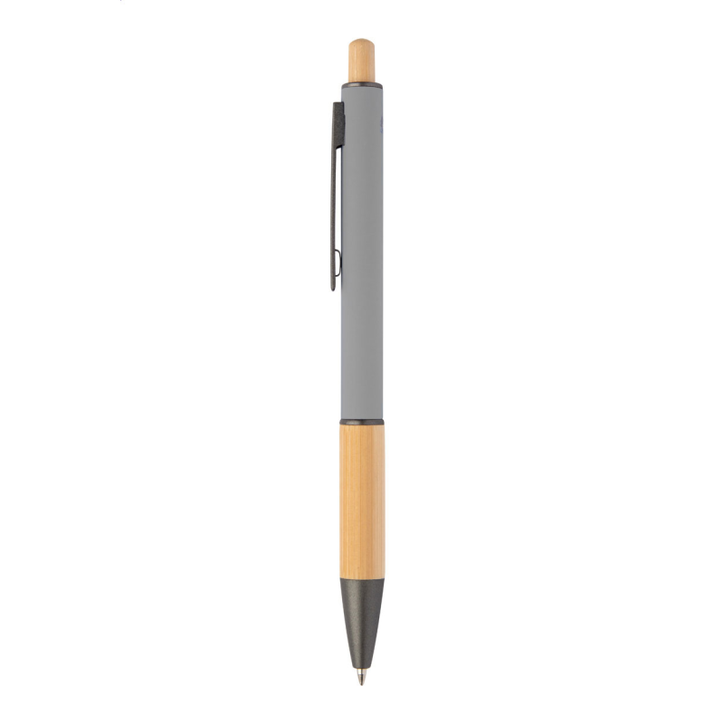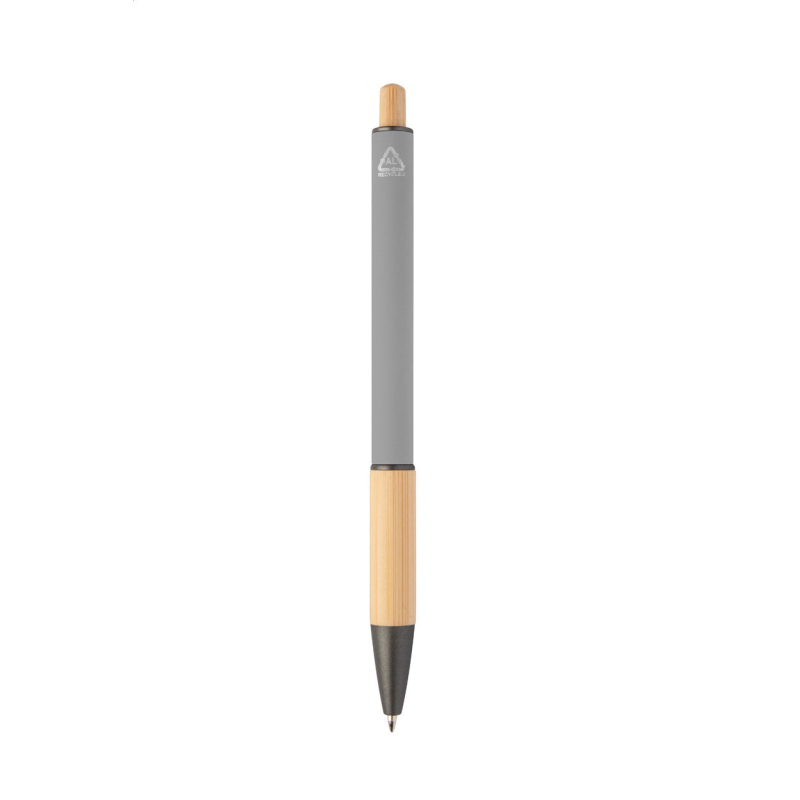 Újrahasznosított alumínium golyóstoll bambusz markolattal és gombbal, gumírozott testtel és fémes részekkel. Kék tollbetéttel szállítjuk.
