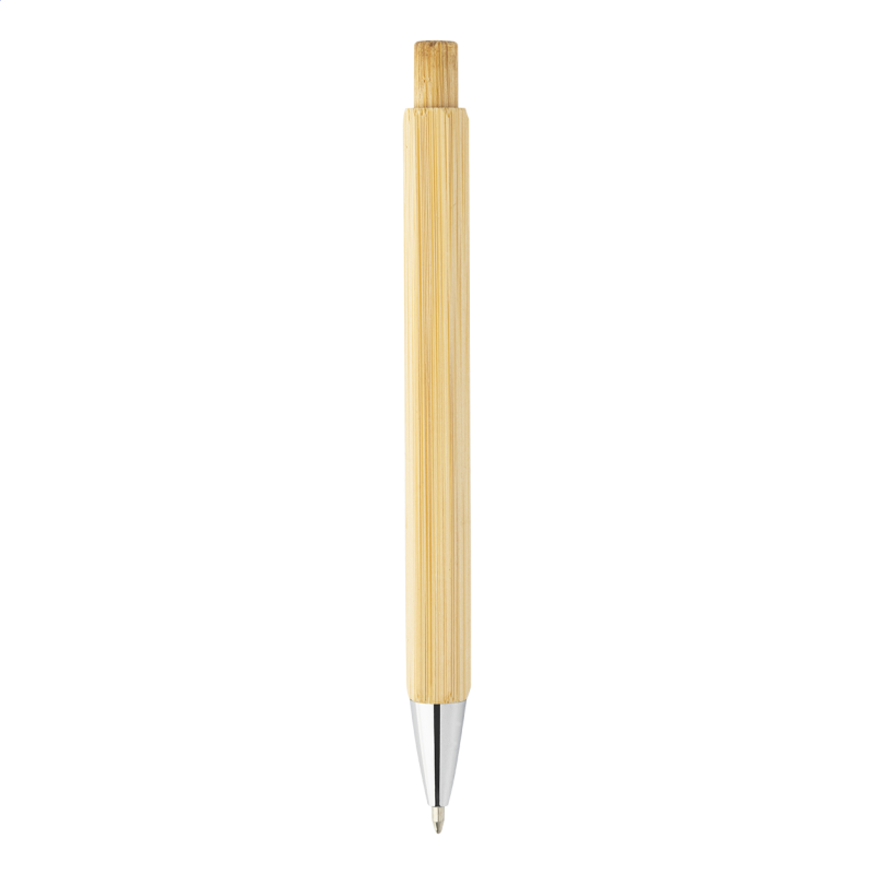 Hatszögletű bambusz golyóstoll krómozott részekkel. Kék tollbetéttel.