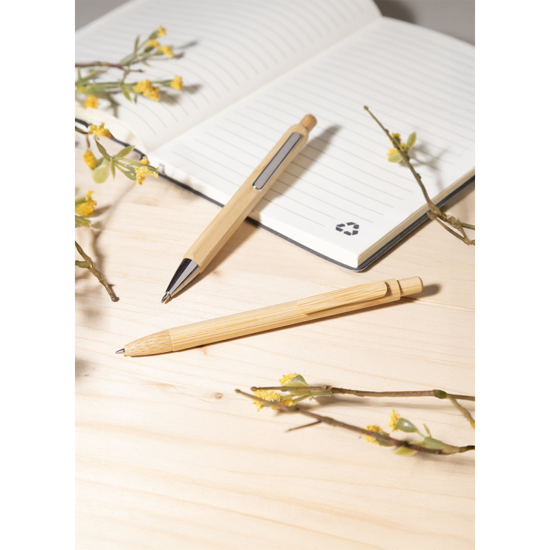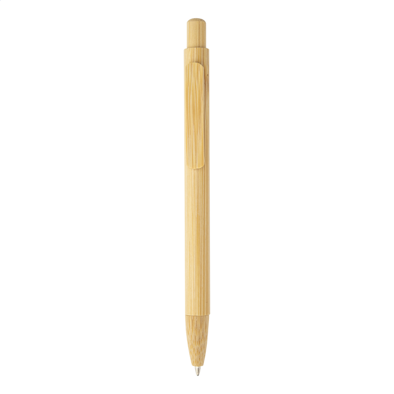 Bambuszból és újrahasznosított alumíniumból készült golyóstoll gumírozott felülettel és fegyverfém klipsszel. Kék tollbetéttel.