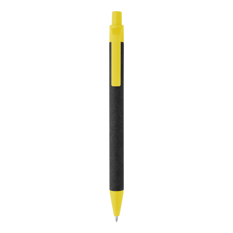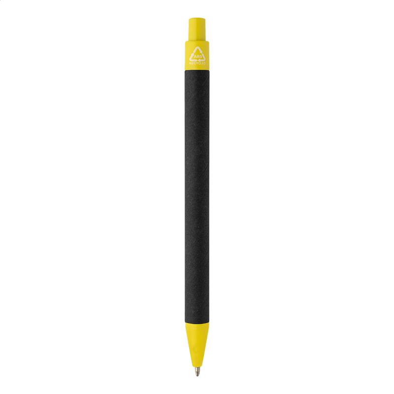 Újrahasznosított papírból készült golyóstoll fekete testtel és újrahasznosított ABS alkatrészekkel. Kék tollbetéttel.